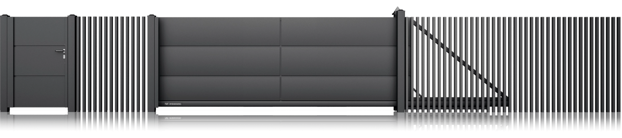 Dieses exklusive Aluminium-Zaunsystem vereint modernes Design, maximale Stabilität und höchste Funktionalität. Die Kombination aus eleganter Seitentür, geschlossenem Schiebetor und offenem Design-Zaunelement mit vertikalen Streben sorgt für eine hochwertige Optik und zuverlässige Sicherheit für Ihr Grundstück.
